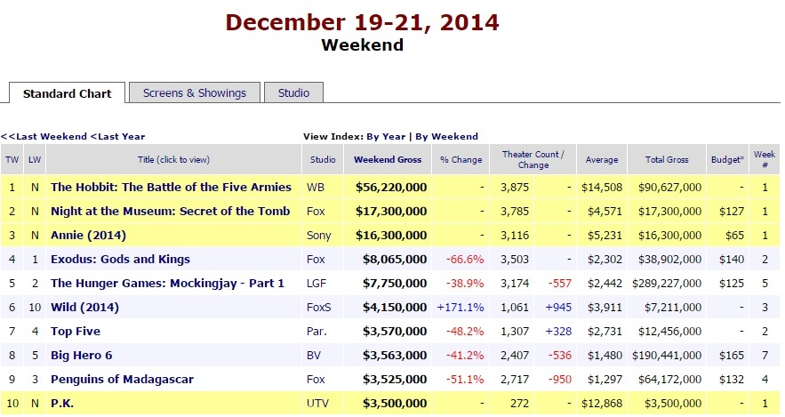 รายได้เปิดตัวของ 3 เรื่องนี้ ต่ำกว่าที่คาดไว้ The Hobbit 3 นี่ต่ำกว่า 2 ภาคแรกประมาณ 20-30 ล้าน (แต่รวมรายได้ของวันพุธ-พฤหัสแล้วก็เกือบ 100 ล้าน) สำหรับ Annie นี่น่าเห็นใจเพราะหนังหลุดออกมาก่อนฉาย ส่วน Night at the Museum 3 ก็เปิดตัวต่ำกว่าสองภาคแรก ส่วนตัวชอบภาคแรก แต่ภาคที่ 2 เฉยๆมาก