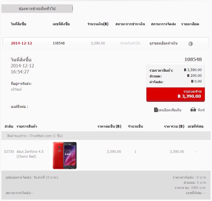 ผมได้ทำการสั่งซื้อ itruemart เนื่องจากไม่ค่อยมีเวลาไปเดินห้าง จึงได้ทำการสั่ง คิดว่าไม่น่ามีปัญหา เลยลืมไปว่ามาตราฐานของ บริษัทนี้เป็นเช่นไร ทำให้เกิดความผิดพลาด ยังมีที่สินค้ามือถือ asus zenfone 4.5 มีราคาไม่เท่าไหร่ แต่ถ้าเป็นสินค้าอย่างอื่นหละ และผู้บริโภคท่านอื่นที่ซื้อสินค้าที่มี ราคาสูง โดยใช้วิธี โพสหน้า web ให้สั่งซื้อ และใช้กฏ ส่งสินค้าภายใน 3-7 วันทำการ ไม่รวมเสาร์-อาทิตย์
