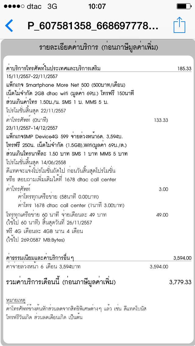 พอดีเปลี่ยนมือถือใหม่ ซื้อiphone 5s จากdtac ซึ่งต้องเปลี่ยนโปรเพื่อให้ได้รับส่วนลด ก็ต้องตัดโปเดิม ตัดถึงวันที่เปลี่ยน(15-22/11) ก็ตามเงื่อนไขจ่ายล่วงหน้า6เดือน 599x6= 3584 ซึ่งก็น่าจะเป็นรอบใหม่ 23/11-22/12 จ่าย6เดือนล่วงหน้า ก็น่าจะสิ้นสุด 23/4/58 ทำไมเป็น 14/4/58???