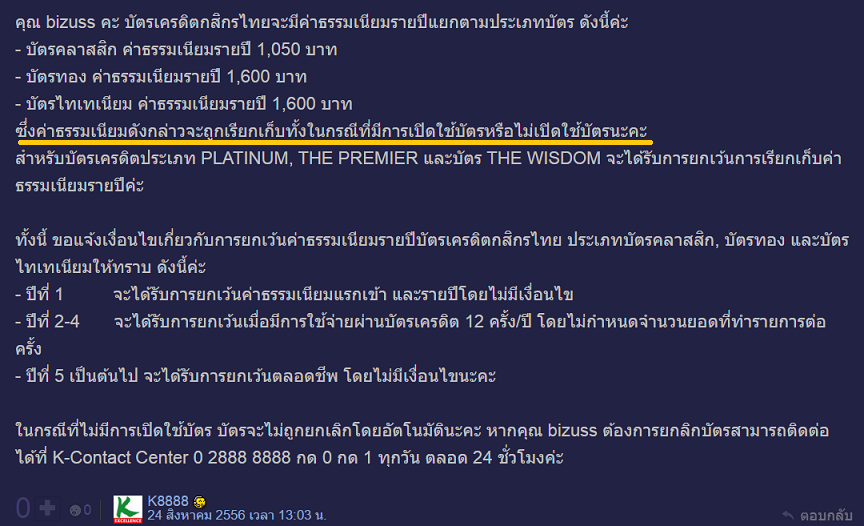 สอบถามเกี่ยวกับค่าธรรมเนียมบัตรเครดิตกสิกรไทยค่ะ