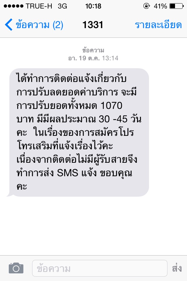 แต่พอถึงเดือนกันยายน + ตุลาคม ค่าโทรก็ยังคงเยอะอยู่ดี เลยโทรไป Call center พนง.แจ้งว่าได้รับเรื่องไว้แล้ว แต่ ณ ตอนนั้นก็ยังไม่ได้คำตอบชัดเจนอะไร คงเช่นเดิม "ยังอยู่ในขั้นตอนการดำเนินงาน" บ้าบอคอห่านที่สุด คือ...มันใช่เรื่องที่เราต้องมาเสียค่าใช้จ่ายที่เราไม่ต้องการรึป่าวคะ? จริงอยู่เงินมันไม่ได้มากมาย มหาศาลอะไร แต่เอาเปรียบกันแบบนี้ สมควรรึป่าว??????? จากนั้นก็มี SMS กลับมา (ตามรูปค่ะ)