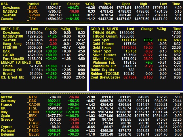 ดัชนีเฉลี่ยอุตสาหกรรมดาวโจนส์ปิดที่ 18,024.17 จุด เพิ่มขึ้น 64.73 จุด หรือ +0.36% ดัชนี NASDAQ ปิดที่ 4,765.42 จุด ลดลง 16.00 จุด หรือ -0.33% ดัชนี S&P500 ปิดที่ 2,082.17 จุด เพิ่มขึ้น 3.63 จุด หรือ +0.17%