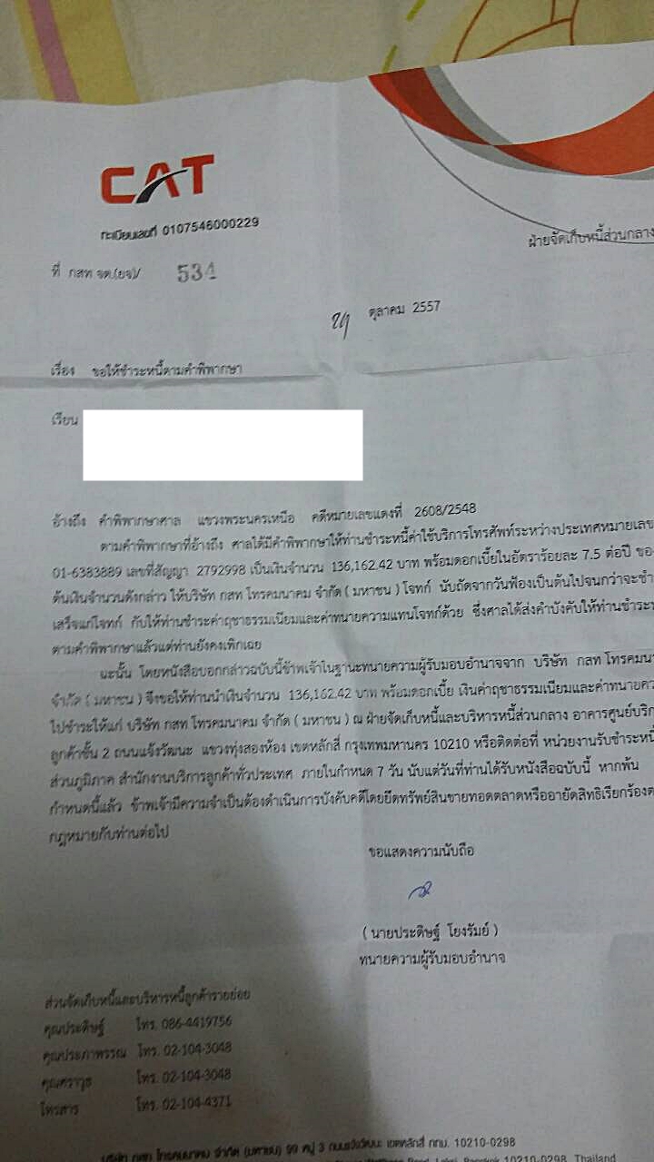 โดนบริษัท CAT เทเลคอม ส่งหมายบังคับคดี มาให้ไปใช้หนี้ค่าโทรระหว่างประเทศ