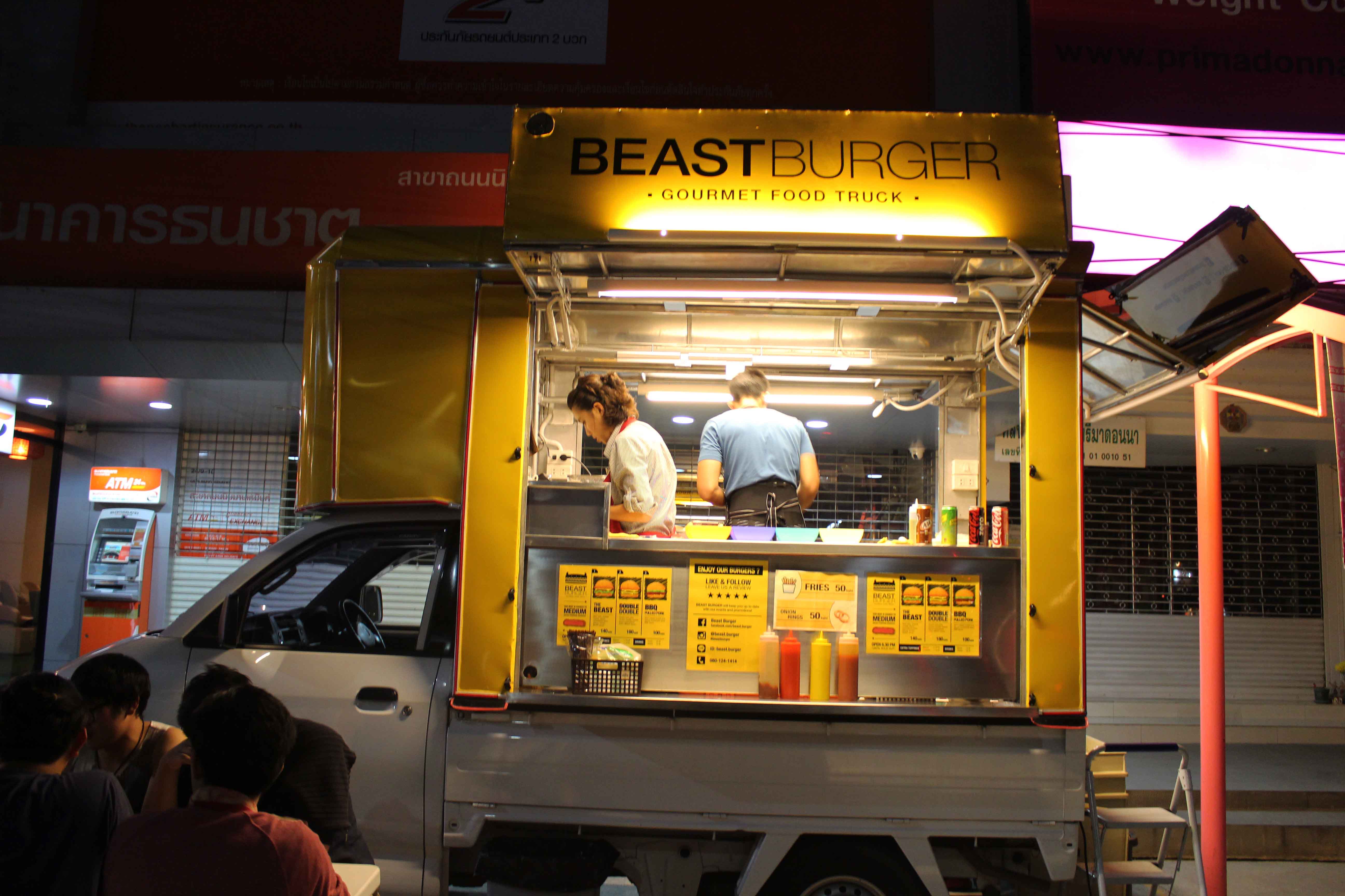 ร้าน Beast Burger ร้านนี้มีไอเดียที่แปลกใหม่ โดยร้านจะอยู่บนรถบรรทุกขนาดเล็ก ซึ่งหาไม่ยากครับ เพราะทางร้านค่อนข้างจะคึกคักพอสมควร