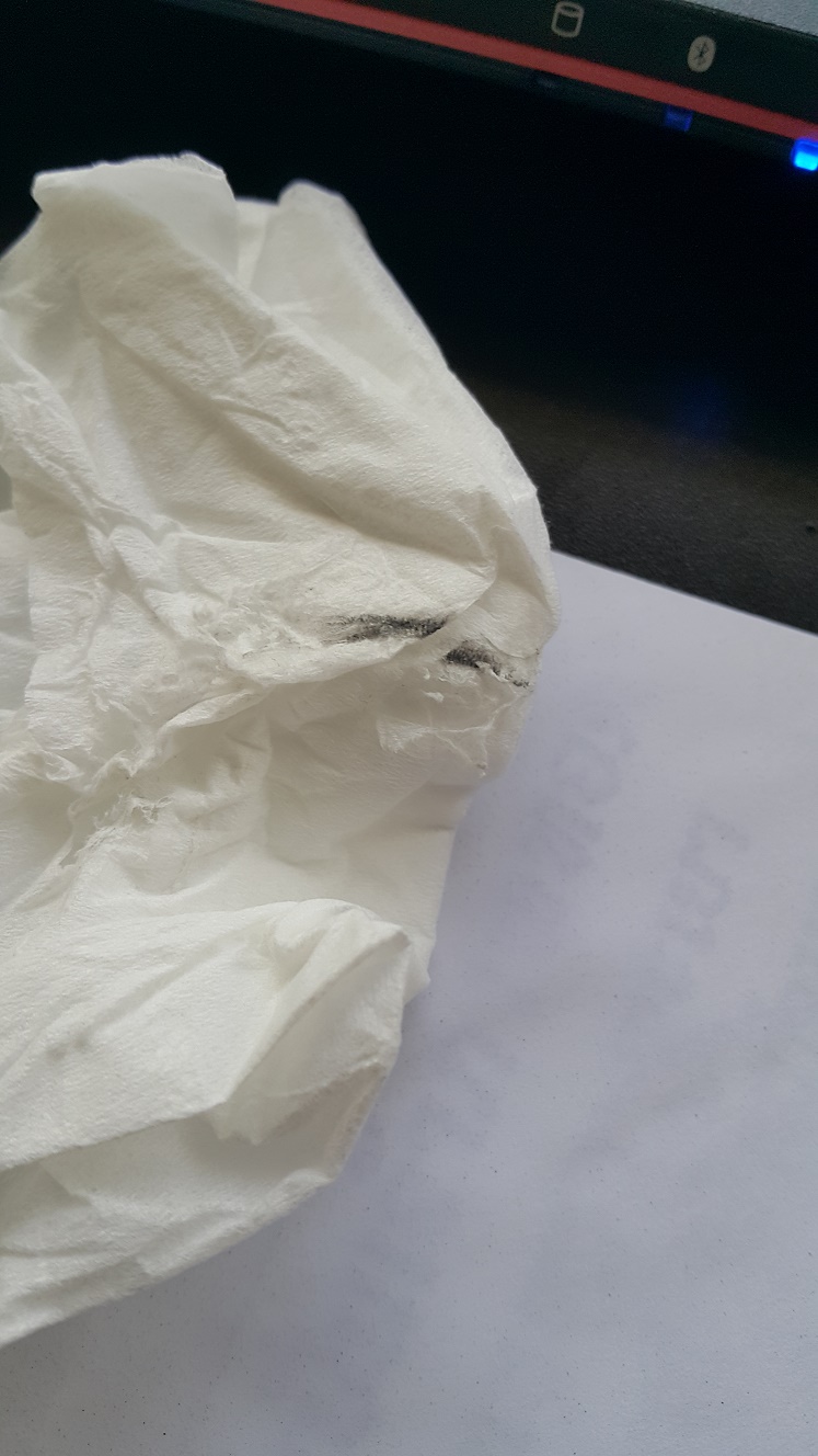 ตอนแรกผมคิดว่าเป็นเหงื่อ หรือขี้ไคล หรืออะไรก็แล้วแต่ที่ไปเกาะ ผมจึงได้เอากระดาษทิชชู่ชุบน้ำเปล่าเล็กน้อย เช็ดๆ ถูๆ ปรากฎว่า ได้ผลลัพท์ตามภาพนี้ครับ
