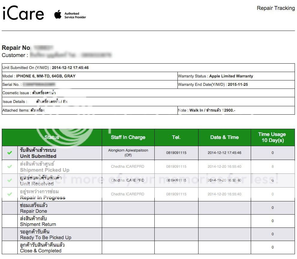 ที่สงสัยคือสถานะที่อยู่ระหว่างการซ่อม เลยโทรไปถาม Apple ที่ 001 800 4412904