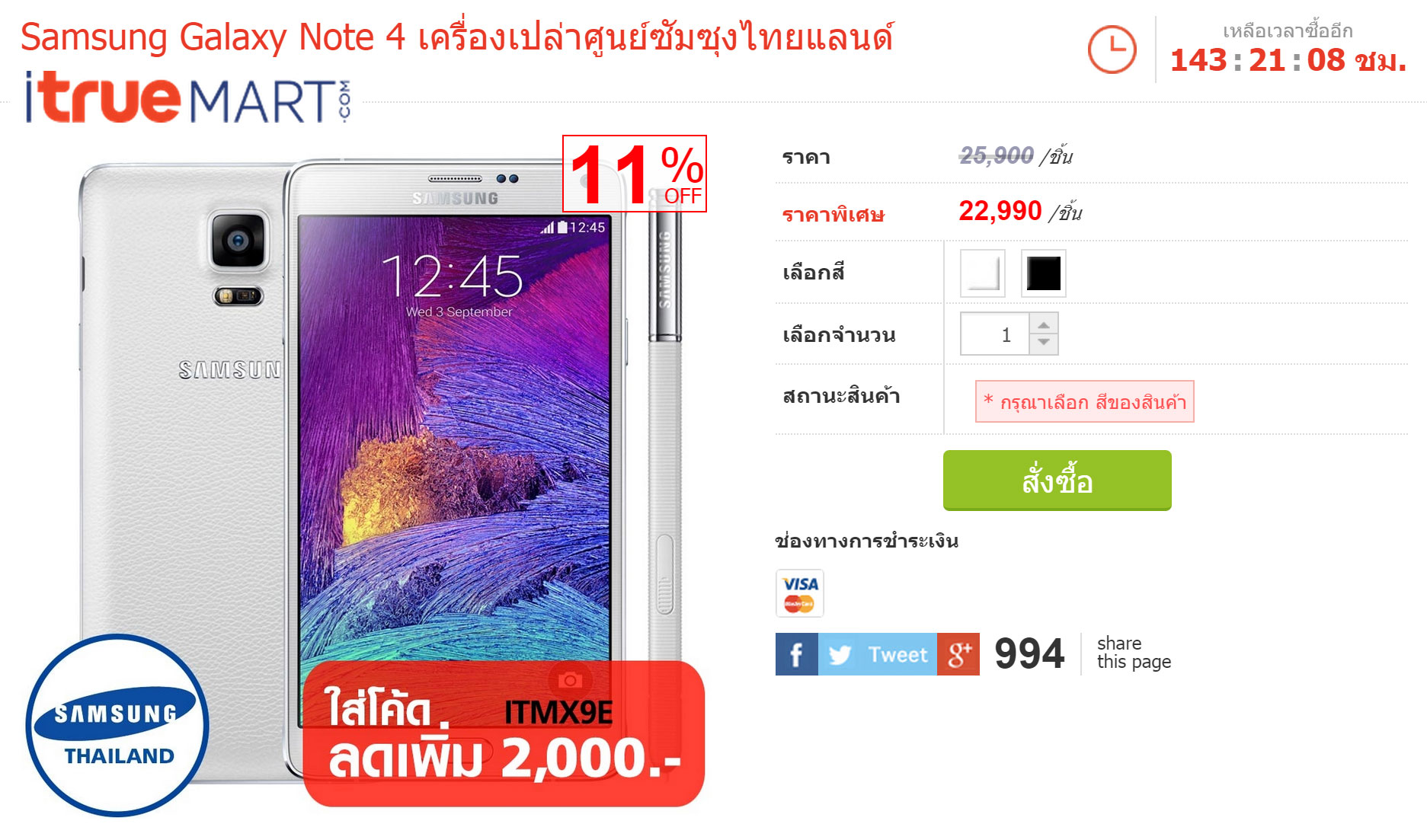 ดีลพิเศษนี้มีเวลาจำกัด ตอนที่ผมเข้าไปนี่เหลือ 140 กว่าชั่วโมง คาดว่าคงไปจบช่วงปีใหม่หรือไม่ถ้าสินค้าหมดก่อนอะไรแบบนั้น ซึ่งในตอนแรกที่กดให้เลือกสีนั้นยังแสดงราคา 22,990 บาท (มีแค่ขาวกับดำนะครับ ไม่มีสีทอง) ขั้นตอนการใส่ code นั้นจะอยู่ในช่วงท้ายสุดก่อนจ่ายเงินครับ