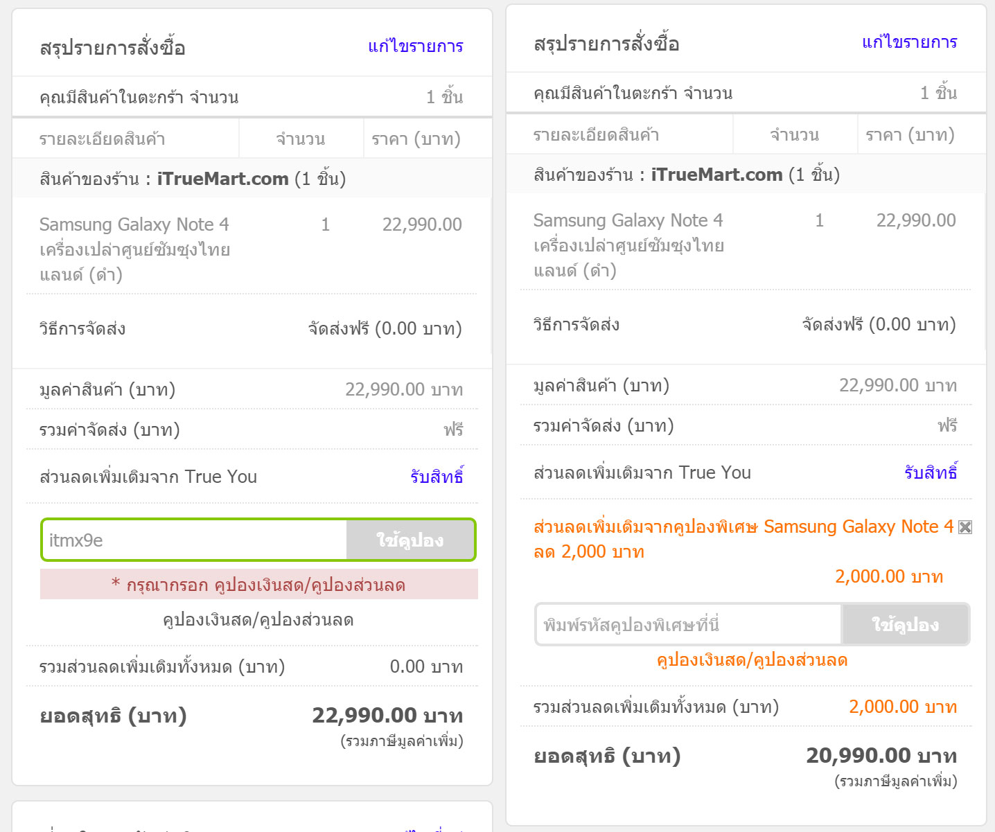 หลังจากกรอกข้อมูลรายละเอียดและการจัดส่งทั้งหมดแล้ว ก็มากรอกรหัส itmx9e เข้าไป เท่านี้ราคา Galaxy Note 4 ก็ลดลงไปเหลือแค่ 20,990 บาทแล้ว \(^ ^)/
