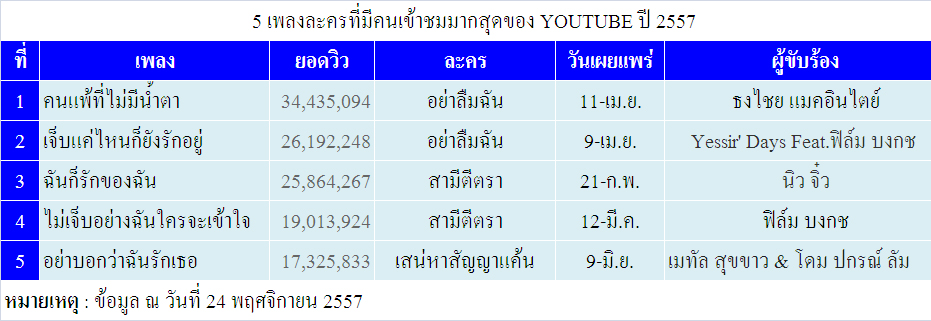 5 เพลงละครที่มีคนเข้าชมสูงสุดของ youtube