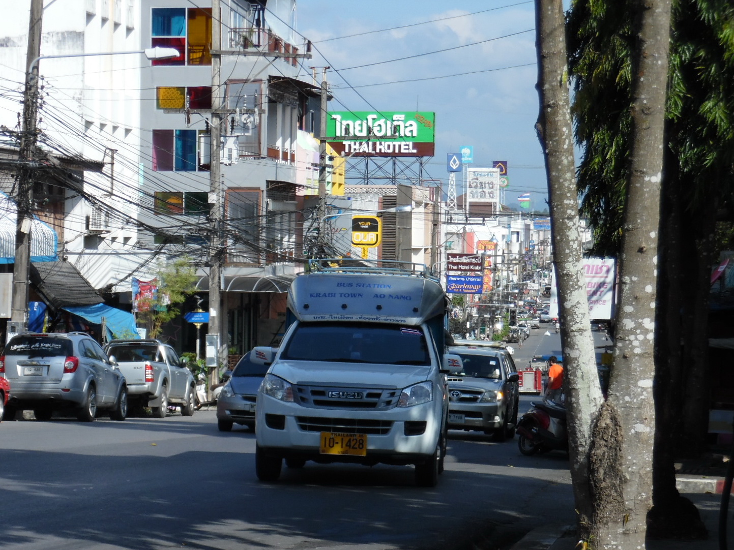 รถเมล์ขาวมาถึงอ่าวนางประมาณสิบโมงครึ่ง จากนั้นเราจึงเลือกลงแถวๆ ใจกลางอ่าวนาง เพื่อที่จะเดินหาที่พัก ซึ่งที่พักที่มองไว้ก็จะเป็นแบบโฮสท์เทลครับ เพราะ