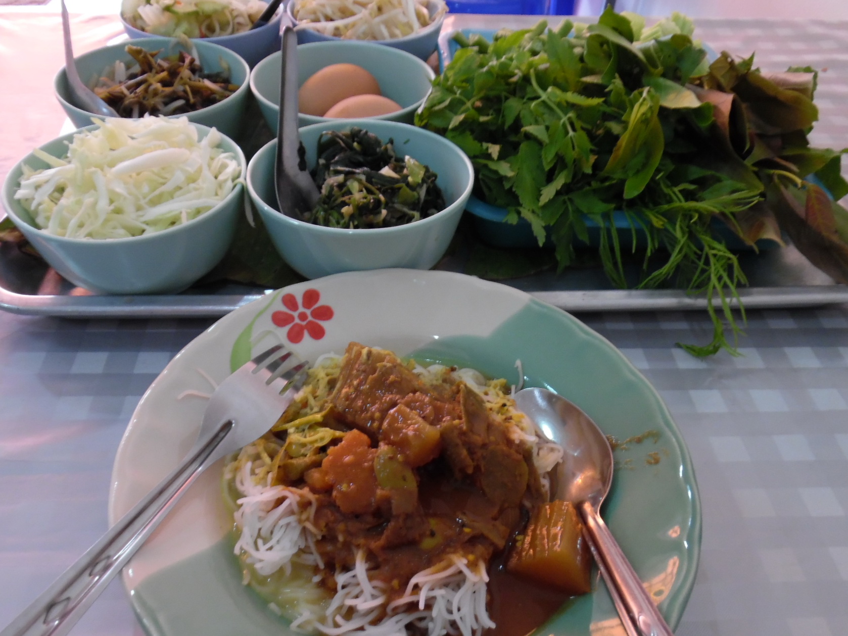 เป็นร้านขนมจีนที่มีจานใส่เส้นไว้เรียบร้อย ส่วนน้ำยาเราราดเองเลยตามใจชอบ เหมือนน้ำยาบุฟเฟ่ มาใต้ทั้งที น้ำยานี้เลยพลาดไม่ได้ "น้ำยาแกงไตปลา" รสชาติถึงเครื่องมาก เผ็ดสะเด่าได้ใจคนทานเผ็ดอย่างเราสุดๆ หรอยอย่างแรงง ผักเครื่องเคียงก็เยอะ (ร้านอาหารใต้จะมีผักเครื่องเคียงให้เยอะมากครับ ชอบตรงเน้) กะไข่ต้มอีกหนึ่งใบ อิ่มมากในราคาเพียง 50 บาทเท่านั้น