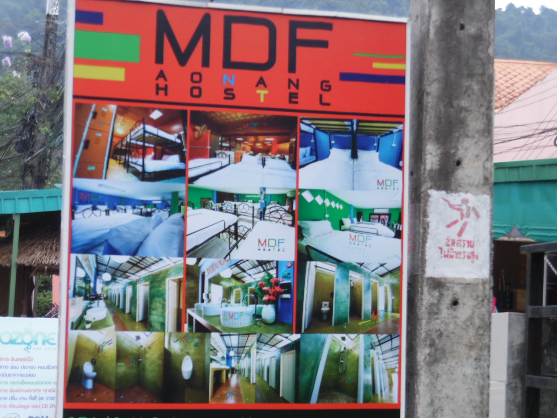 แต่ในการหาที่พักนั้นไม่ง่ายเลย เนื่องจากไม่ได้จองที่พักไว้ จึงต้องทำการ walk in อีกรอบ มีฝนตกมาปรอยๆ อยู่ประมาณ 5 นาที ถือว่าโชคดีมากที่ไม่เปียก ถามที่พักมาตลอดทาง ก็เต็ม หรือไม่ก็ไม่ใช่แบบที่พักที่เราต้องการ(แพง 555) เดินขึ้นมาจากอ่าวนางประมาณ 2-3 กิโล จึงได้พบกับที่พักของเรา นั่นคือ MDF Hostel อยู่ข้างๆ ที่ทำการไปรษณีย์ครับ พักอยู่ 4 คืน คืนละ 250 บาท!!! ซึ่งถือว่าราคาโอเคมาก เจ้าของที่พัก รวมถึงพนักงานทุกคนก็ใจดี สภาพยังใหม่ๆ อยู่เลย สะอาดด้วย ตอนกลางคืนก็เงียบดีไม่เสียงดัง