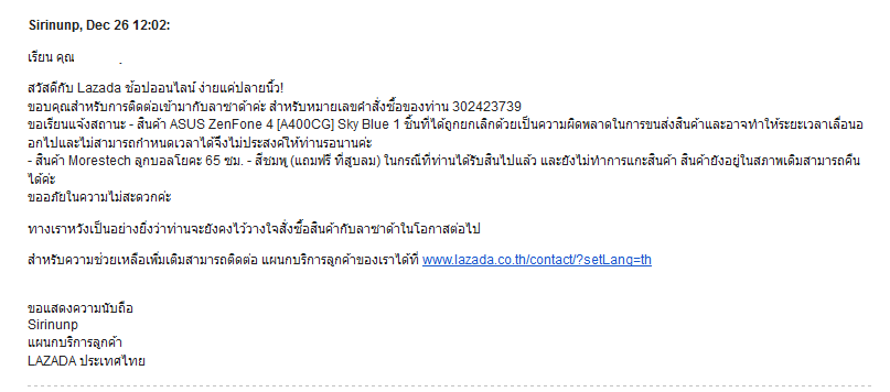 LAZADA : ทางเราต้องขออภัยลูกค้านะค่ะ ที่ต้องทำการยกเลิกคำสั่งซื้อของลูกค้าเนื่องจากทางเราเกรงว่าใช้เวลาในการจัดหาให้ลูกค้านานเกินไปและจะไม่ทันกำหนดในวันที่ 26 นี้ค่ะ ทางเราจะทำการคืนเงินให้ผ่านช่องทางที่ลูกค้าชำระมานะค่ะ
