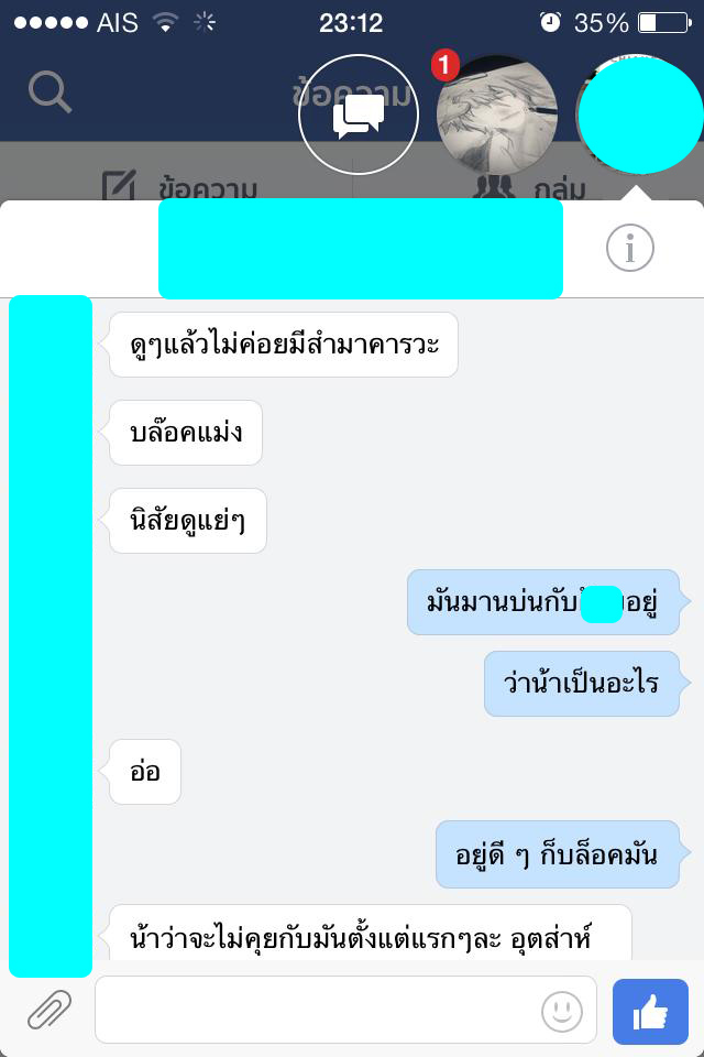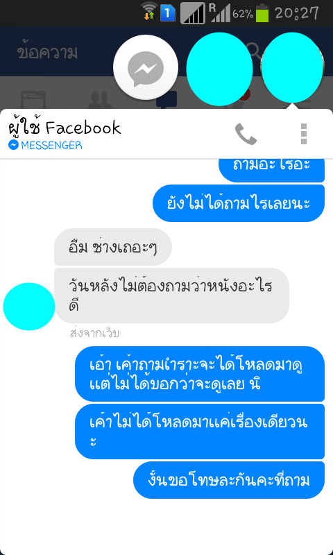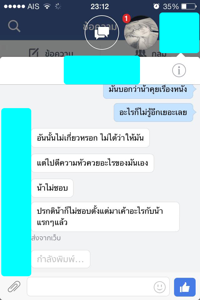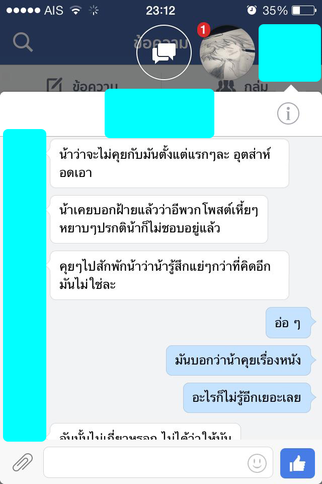 เรางงคะ เอ้าคือไร เราก้เลยบอกว่าเราไม่ได้โหลดหนังเรื่องเดียว เราไล่ดูทีละเรื่อง เราดหลดมาตั้งเยอะ แล้วก็ขอดทดเค้าไปที่ถาม เเค่นั้นแหละคะ เค้าบล๊อคเฟสเราเลย งงเข้าไปอีกทีนี้ เราก็เลยคุยกับเพื่อนคะ เพื่อนคะเพื่อนที่รู้จักกับน้าเค้าอ่านะ เราก้คุยกันธรรมดาคะ บ่นนั้นบ่นนั้นนี้ไปเรื่อยแล้งน้าเค้าก็ทักเพื่อนเรามาคะ เราเลยถามว่าเป็นไงมั้ง เพื่อมันแคปรูปมาให้ดู พอเราอ่านนี้หน้าชาเลยคะ ช็อคอะ คือเเบบไม่คิดว่าเค้าจะเป้นคนแบบนี้