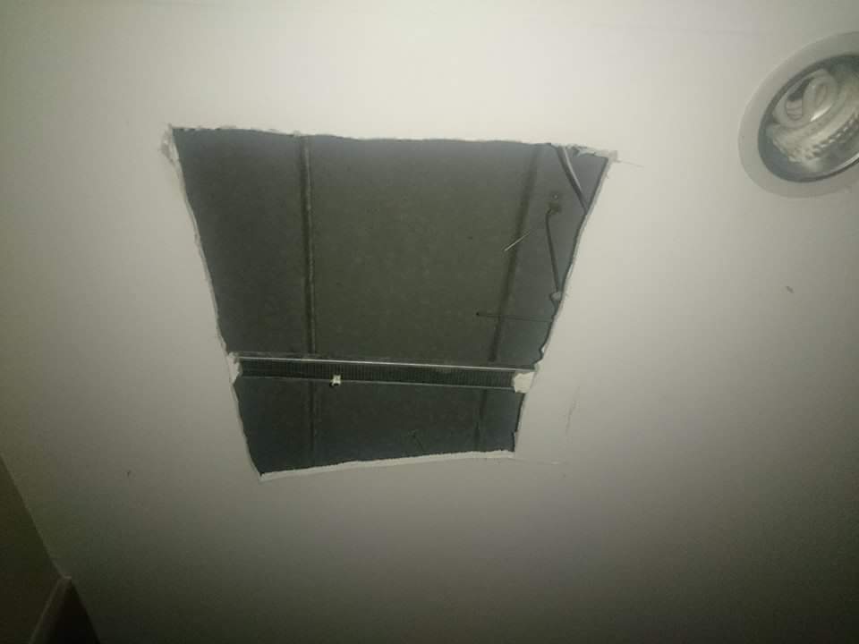 เขาตัดซ่อมสายไฟครับ ที่น้ำมันสาดเข้ามา ผมไม่รู้ว่าฝ้าแบบนี้เขาเรียกว่าอะไร