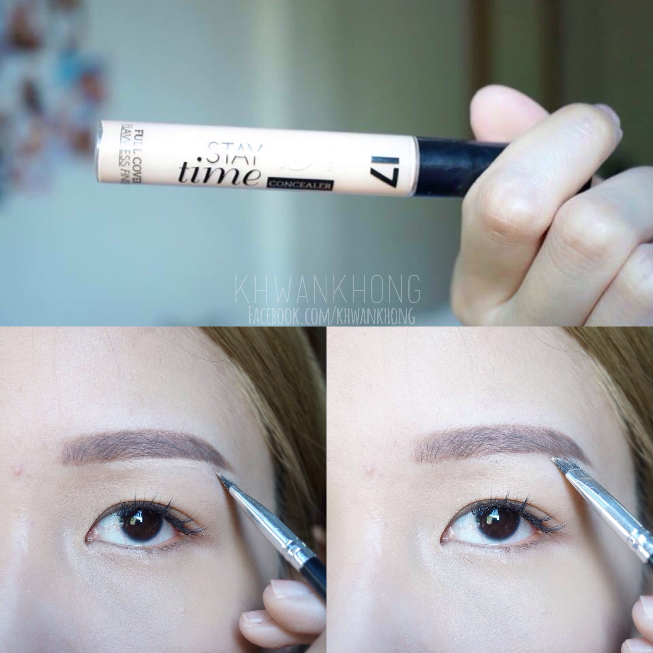 เทคนิคการเขียนคิ้วให้คมเป๊ะอีกอย่างนึงคือการใช้คอนซีลเลอร์ตีกรอบคิ้วค่ะ ขวันใช้แปรงหัวตัด ทาคอนซีลเลอร์ให้เป็นเส้นใต้ท้องคิ้ว เเละใช้บริเวณหัวคิ้วที่สักมาด้วย เพื่อให้รอยสักอ่อนลง