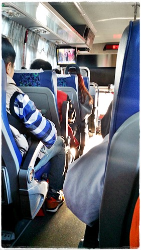 เสร็จแล้วตามป้ายลงไปซื้อตั๋วรถบัสเข้าเมืองของKou-Kuang 125 NT ซื้อตั๋วเสร็จไปต่อแถวเล้ย รอตามคิว ถ้ารถเต็มก็รอคันต่อไป เค้าจะเอาแท็กมาติดกระเป๋าที่ใส่ใต้รถให้ ไว้เช็คตอนเอาของลง ในรถมีทีวีแต่ฟังไม่ออก ไม่มีตั๋วยืน จอดให้ลงที่ East exit ของ Taipei railway station