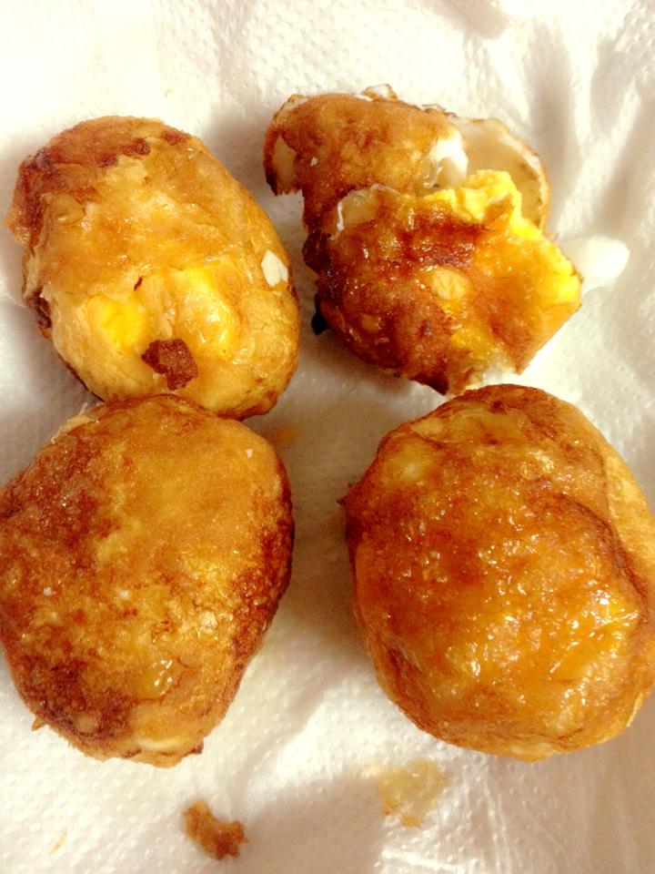3.นำไข่ลงทอดจนเหลืองประมาณ 70% แล้วเร่งไฟแรงเพื่อไล่น้ำมันไม่ให้ไข่อมน้ำมัน จนเหลืองกรอบ