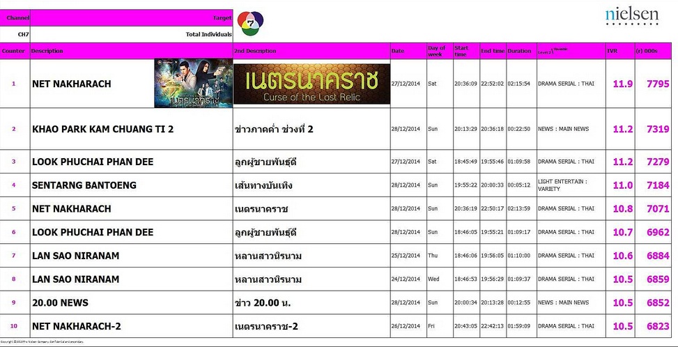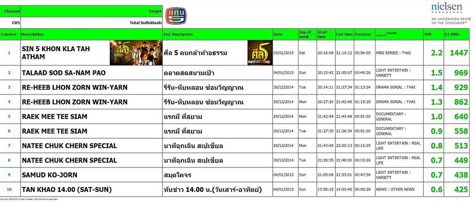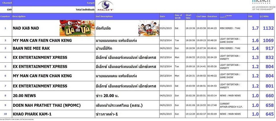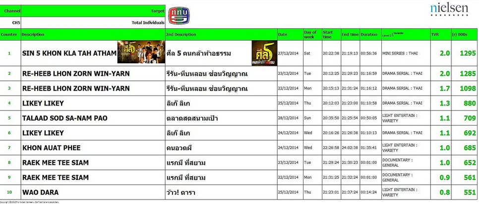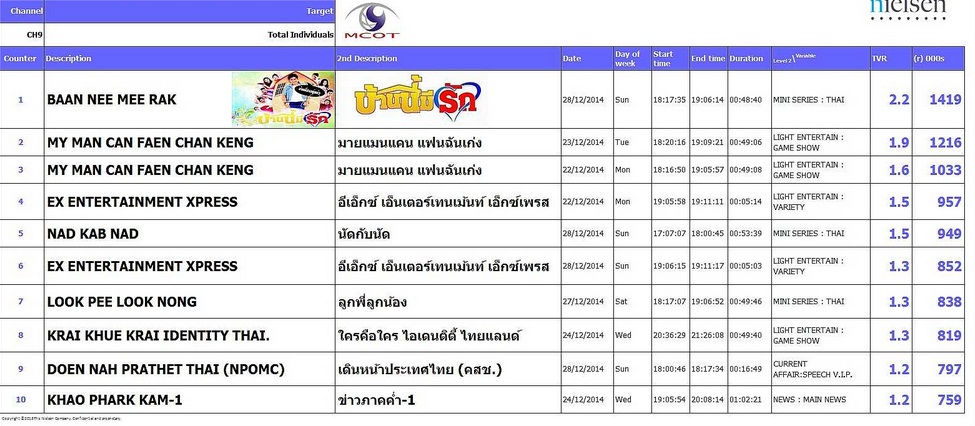 เรตติ้งมาแล้ว 10 อันดับรายการโทรทัศน์ วันที่ 15 ธ.ค.57 - 4 ม.ค. 58