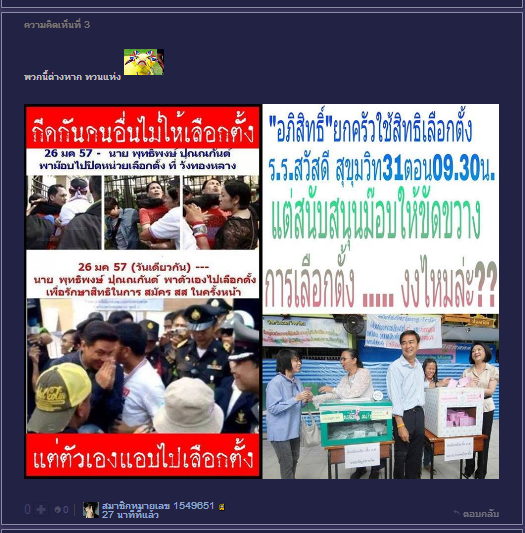 http://pantip.com/topic/31580786 วันที่ 2 ก.พ. เลือกตั้ง ไอ้พวกที่ต่อต้านเลือกตั้ง แน่จริงอย่าไปเลือกนะครับ ในเพจเจ๊ปอง แกบอกไม่ได้พูด ดังนั้น "Crimson Tide" ไปหาข้อมูลมาแชร์ให้ประจักษ์แก่