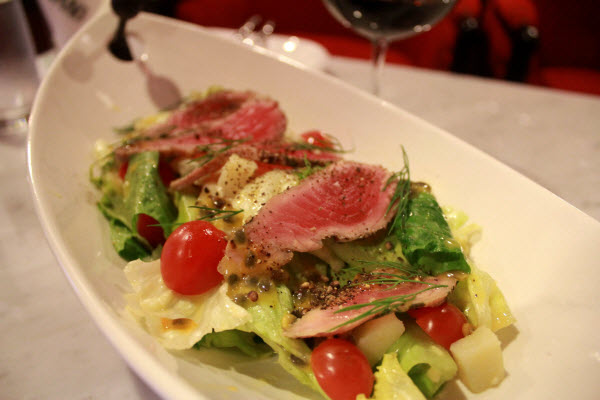 น่องไก่ตุ๋นไวน์แดง เมนูนี้ทีเด็ดมาก แค่กลิ่นจากซอสเห็ดไวน์แดงผสมเครื่องเทศ ก็ชวนให้น้ำลายสอตั้งแต่จานถูกเสิร์ฟ เพราะมันหอมกลิ่นเครื่องเทศและมันอบมาก ลองชิมก้อนสีเหลืองๆ ก่อน (ตอนแรกยังไม่รุ้ว่าคืออะไร) มันอร่อยมาก (อยากเติมไม้ยมกซัก 18 ตัว) ปกติเวลาทานมันอบเราจะเคยชินกับรสชาติจืดๆ เค็มนิดๆ แต่นี่เชฟทำมันอบออกมาเป็นก้อนๆ ปรุงรสด้วยเครื่องปรุง เลยได้มันอบปรุงรสที่เต็มไปด้วยรสชาติ เค็มๆ มันๆ แต่เจือความหวานของมัน และผสามเผ็ดของเครื่องเทศอยุ่เบาๆ จนอดไม่ได้ที่จะต้องกินชิ้นต่อไป มาถึงเนื่อไก่เข้าใจว่าน่าจะตุ๋นมาอย่างดี เพราะเนื้อนิ่มจนสามารถเลาะออกจากกระดูกได้โดยง่าย แต่ไม่เละ กับซอสสีแดงที่ให้รสเค็ม มัน แต่แทรกเข้าเนื้ออย่างกลมกล่อม ทานคู่กับมันอบและเห็ดจากซอส ให้รสชาติละมุนลิ้นไปอีกแบบ ทานไปทานมาแอบเผลอเอาซ้อมไปจิ้มสลัดมาทานคู่กันเลย รสชาติกำลังดี