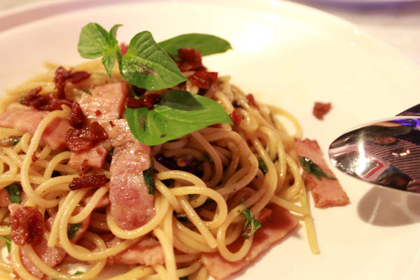 สปาเก็ตตี้เบคอนผัดพริกแห้ง เมนูแนะนำจากทางร้าน ไม่รู้จะสั่งอะไร เลยให้ทางบริกรช่วยแนะนำเมนู ตอนมาเสิร์ฟกลิ่นเครื่องเทศและเบคอนงี้โชยมาแต่ไกล เส้นสปาเก็ตตี้เหนียมนุ่มกำลังดี ผสานรสชาติเค็มๆ มันๆจากเบคอน และซอสที่ช่วยทำให้เส้นมีรสชาตกลมกล่อม ผสานกลิ่นเครื่องเทศที่เชื้อเชิญให้รู้สึกเจริญอาหาร พร้อมพริกแดงที่นอกจากจะช่วยให้สปาเก็ตตี้จานนี้ดูมีสีสันแล้ว ยังทำให้อาหารจานนี้รสชติจัดจ้านจากความเผ็ด(ไม่มาก)ของพริก และทำให้อาหารจานนี้รสชาติกำลังดีไม่เลี่ยนอีกด้วย