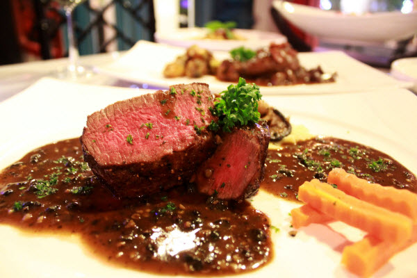 เทอเดอร์รอยด์สเต็ก แบล็คเป็ปเปอร์ซอส ย่างกำลังดีแบบ Medium ค่ะ ด้วยความที่เป็นคนชอบทานเนื้อมากเลยเรื่องมากกับเนื้อเป็นพิเศษ แต่แค่กลิ่นเนื้อย่างและพริกไทตอนเสิร์ฟก็ รู้สึกอยากลองแล้ว เริ่มจากเอามีดหั่นเนื้อ ซึ่งหั่นง่าย นิ่มกำลังดี ไม่เหนียวและแห้งจนเกินไป แสดงว่าหมักได้ที่ เคี้ยวง่ายและย่างได้ที่ เนื้อมีความฉ่ำจากไขมันของเนื้อขณะย่างและรู้สึกได้กลิ่นรสชาติและเครื่องเทศจากการหมักเนื้อ ทานคู่กันซอสราดพริกไทยสูตรพิเศษ ที่ให้ความรู้สึกเค็มๆ มันๆ แต่เต็มไปด้วยกลิ่นของเครื่องเทศ ทานคู่กับไวน์แดงแบบเข้ากันสุดๆ เผลอแปปเดียวกัน ทานกันจนเกลี้ยงนั่งฟังเพลงเคล้าบรรยากาศร้านเสียแล้ว