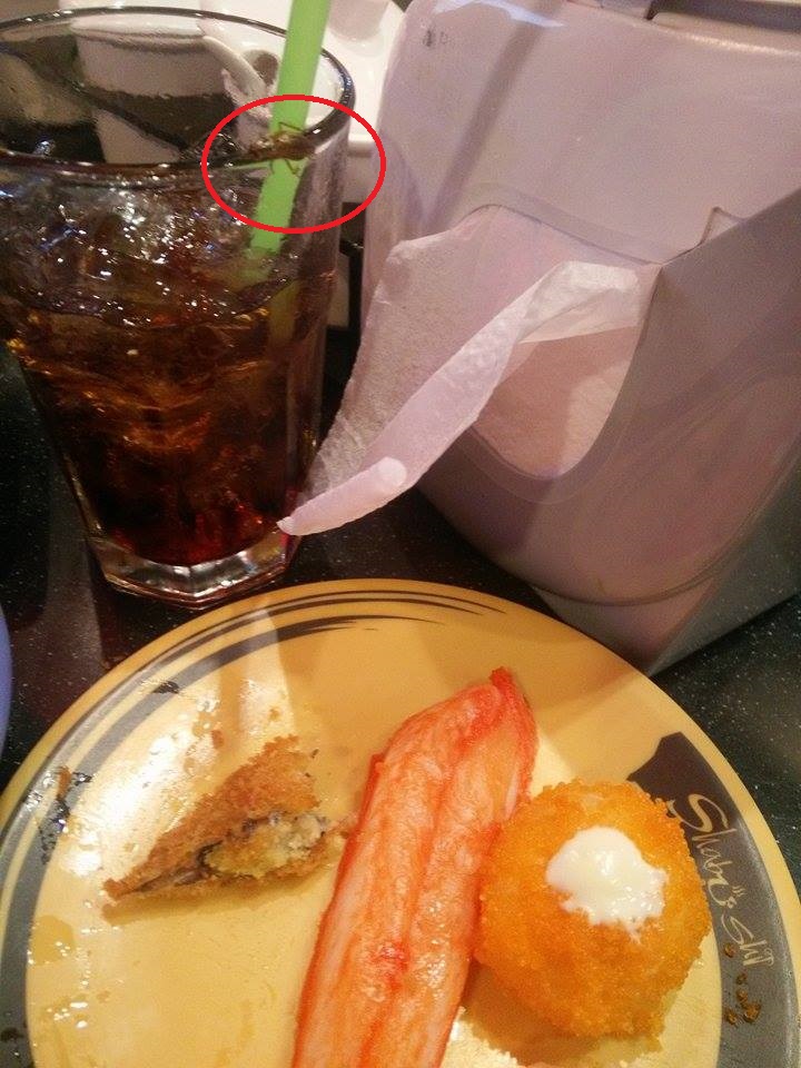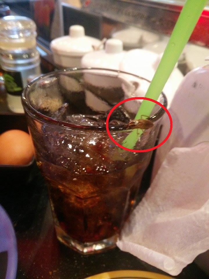 เเละมานั่งกิน คุยกัน พอสักพักจขกท. ก็เลยหันไปมองเเก้วน้ำเพื่อนพบว่ามีเเมลงสาบกำลังวิ่งวนอยู่ขอบปากเเก้ว
