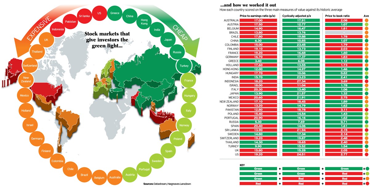 สำหรับปี 2015 นี้ เว็บไซต์ Telegraph.co.uk ได้ทำสรูปตลาดหุ้นทั่วโลก ว่าตลาดไหนแพง ตลาดไหนถูก แม้จะเป็นข้อมูลเดือน Jun 2014 แต่ก็ยังใช้ประกอบการลงทุนได้ดี โดยใช้เครื่องมือชี้วัด 3 อันคือ