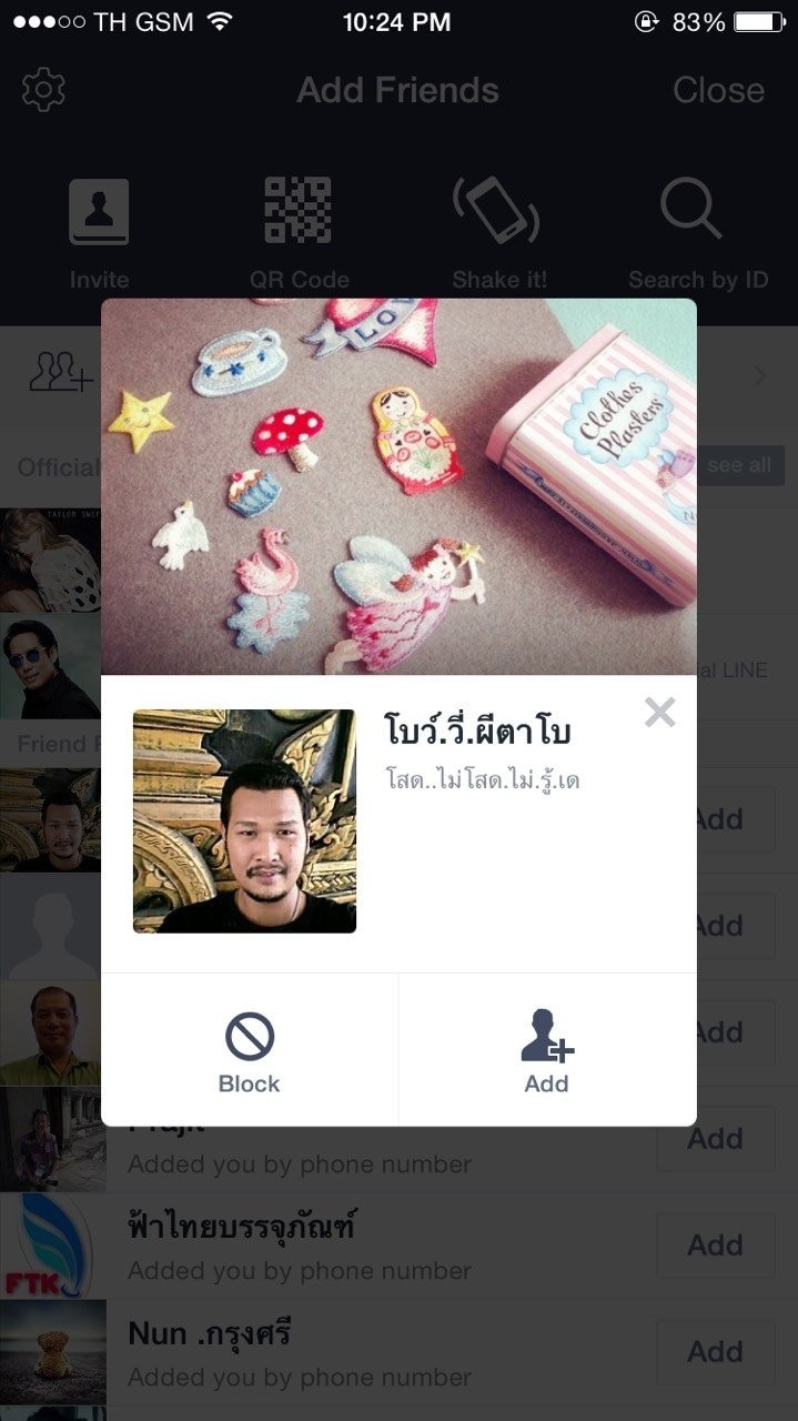 เรายังเหลือไอโฟนอยู่เครื่องนีง ที่ไม่ค่อยมีใครมีเบอร์ เอาไว้ใช้อินเทอเนตซะส่วนใหญ่ แล้วนั่งรถกลับบ้านไม่ได้เอะใจ มีไลน์เด้งขึ้นมาว่า Add you by phone number เราก็งง คือไม่ได้ให้เบอร์ใครนานมาก ช่วง 5-6 เดือนที่ผ่านมาก็ไม่มีใครมา Add เพิ่ม พอกลางคืนคุยกับเพื่อนใน Group Line บอกว่ามือถือเราหาย แต่เราติดตามไม่ได้เลย เพราะไม่ได้ลงโปรแกรมตามหาเครื่องไว้ เพื่อนเราก็บอกว่า มี Line นึงมา Add วันนี้ ไม่รู้เกี่ยวข้องกับมือถือเราที่หายมั้ย เพื่อนแคปหน้าจอมาให้ดู คือคนเดียวที่มาแอดเราในเครื่องไอโฟน