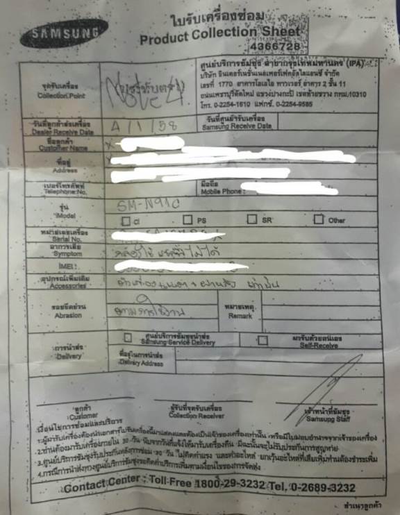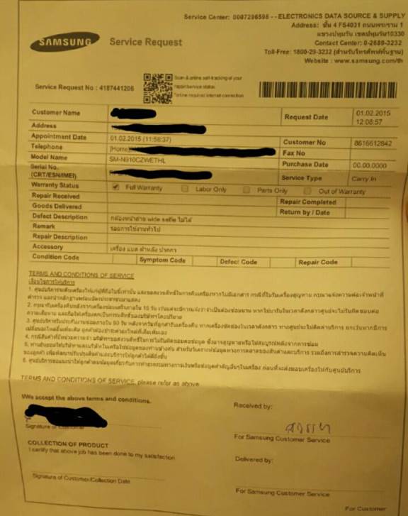วันที่ 02 มค 58 – ช่างโทรมาแจ้งว่าอะไหล่ที่สั่งมาแล้ว เราจึงนำเครื่องไปทิ้งไว้ที่ศูนย์ตั้งแต่สายๆ ช่างบอกว่ามารับได้ตอนเย็น จนตกเย็นเรากลับมาติดต่อรับเครื่อง พอช่างนำเครื่องมาให้แล้วก็บอกว่า wide selfie ยังใช้งานไม่ได้ ต้องเปลี่ยน mainboard อีก (เปลี่ยนแล้วรู้ว่ายังใช้งานไม่ได้ ทำไมไม่โทรแจ้งเรา ทั้งๆ ที่เราก็กำชับไว้ว่าให้โทรแจ้ง พนักงานก็ขอเบอร์เราไปแล้ว เราก็ต้องเสียเวลาไปๆ มาๆ อยู่ตรงนี้) เราเลยเอาเครื่องกลับมา เพราะตอนแรกหวังว่าเมื่อเปลี่ยนแล้วจะสามารถใช้งานได้เลย บวกกับมีธุระจำเป็นที่จะต้องใช้เครื่องต่อ