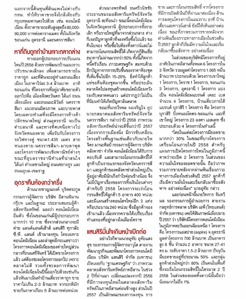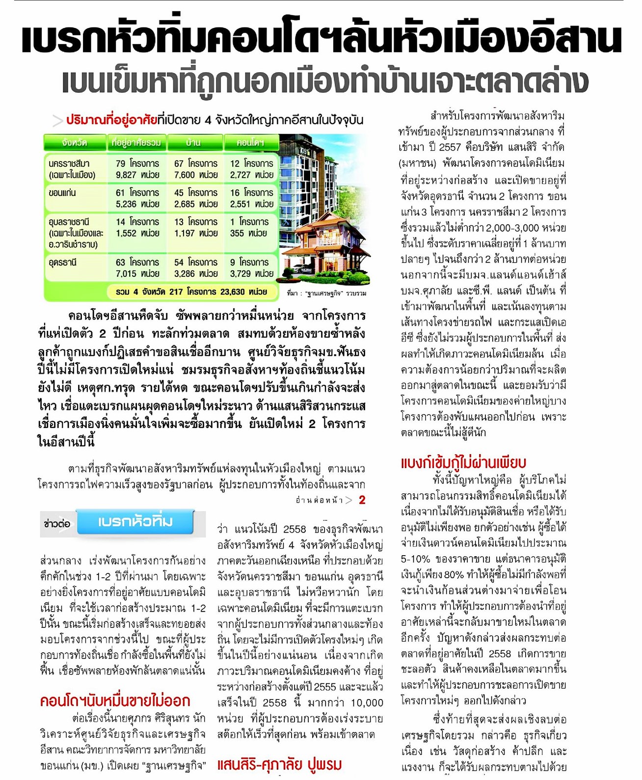 11/01/58 ฐานเศรษฐกิจ เบรกหัวทิ่มคอนโดฯล้นหัวเมืองอีสาน