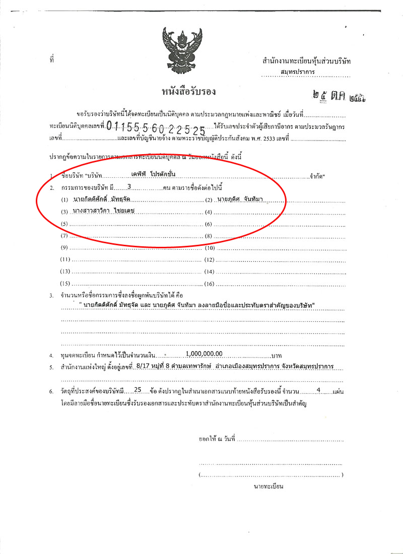 โดยมีหลักฐานประกอบเป็น “ใบสำคัญรับชำระเงินลงหุ้น” ปรากฎรายชื่อ นายกิตติศักดิ์ มัทธุจัด และนายภูดิศ จันทิมา เป็นผู้รับเงินในฐานะ "กรรมการผู้จัดการ"
