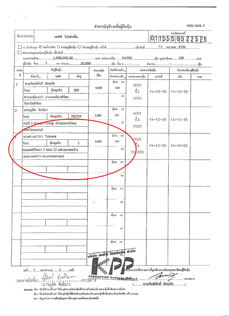 ขณะที่บัญชีรายชื่อผู้ถือหุ้น บริษัท เคพีพี โปรดักชั่น จำกัด ณ วันที่ 14 ต.ค.56 มีผู้ถือหุ้นจำนวน 3 คน รวม 10,000 หุ้น มูลค่าหุ้นละ 100 บาท ได้แก่