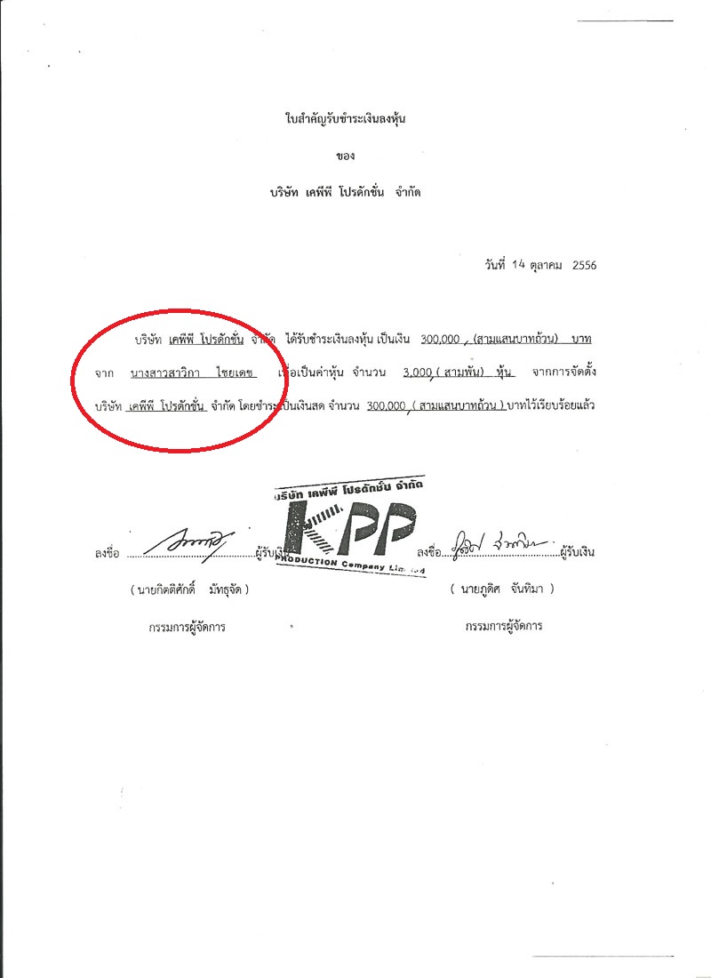 ทั้งนี้ ในขั้นตอนการจดทะเบียนจัดตั้ง บริษัท เคพีพี โปรดักชั่น จำกัด มีการระบุว่า บริษัทฯ ได้รับเงินสดจาก น.ส.สาวิกา จำนวน 300,000 บาท เป็นค่าตอบแทนในการถือหุ้นจำนวน 3,000 หุ้น