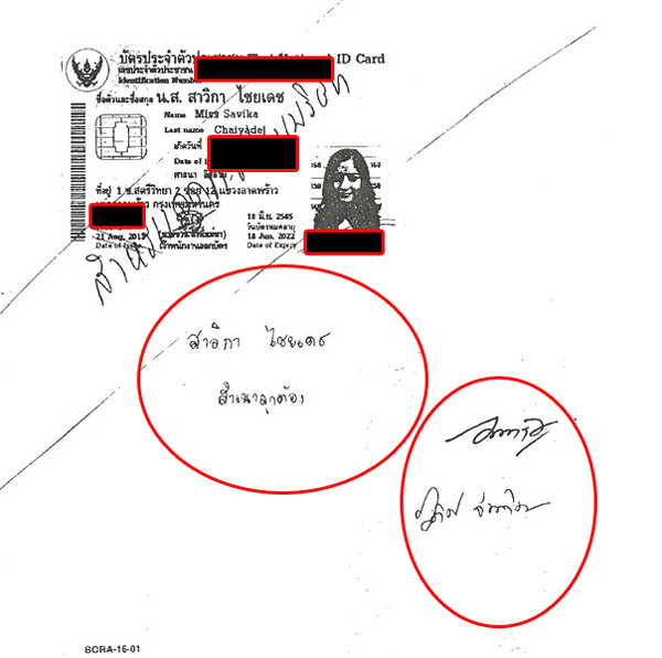 จากการตรวจสอบยังพบว่า ในขั้นตอนการจดทะเบียนจัดตั้งบริษัท รวมถึงการชำระเงินค่าหุ้น 300,000 บาท มีการแนบ "บัตรประจำตัวประชาชน" ของ น.ส.สาวิกา ซึ่งมีการลงลายมือชื่อกำกับและรับรองสำเนาถูกต้องสำหรับการจดทะเบียนบริษัทไว้ด้วย