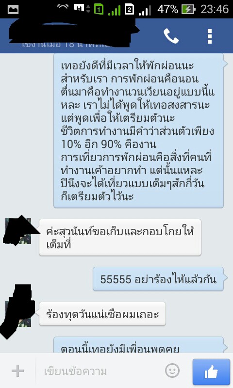 ส่วนผมน้ำตาตกนะครับ แต่ไม่อยากให้ทะเลาะกันผมเลยอยู่เฉยๆ ไม่โวยวายดีกว่า แต่ข้างในเจ็บนะครับ ทำทุกอย่าง พยายามทุกอย่าง แต่เหมือนสิ่งที่ผมทำมันไร้ค่า คือผมรู้นะว่าเพื่อนสำคัญ แต่เราคุยกันสองคน ผมอยากได้คำยอ คำพูดซึ้งๆ กับคนอื่นเค้าบ้าง เพราะผมกับแฟนก็อยู่ไกลกันพอสมควร แค่ระยะห่างที่มันทำให้เจ็บแล้ว คำพูดแฟนผมยิ่งตรอกย้ำผมขึ้นไปอีก