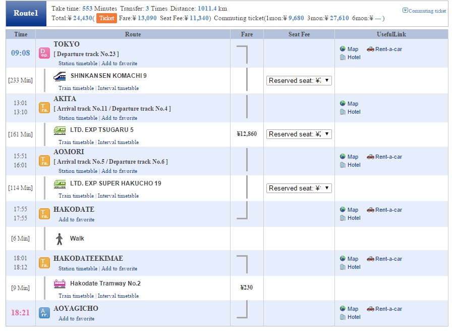 ถ้าตาม Hyperdia ก็ตามนี้ครับ เรื่องซื้อตั๋วหรือต่อรถไฟอะไรยังไง รอท่านอื่นมาตอบครับ ผมไม่รู้เรื่อง.....