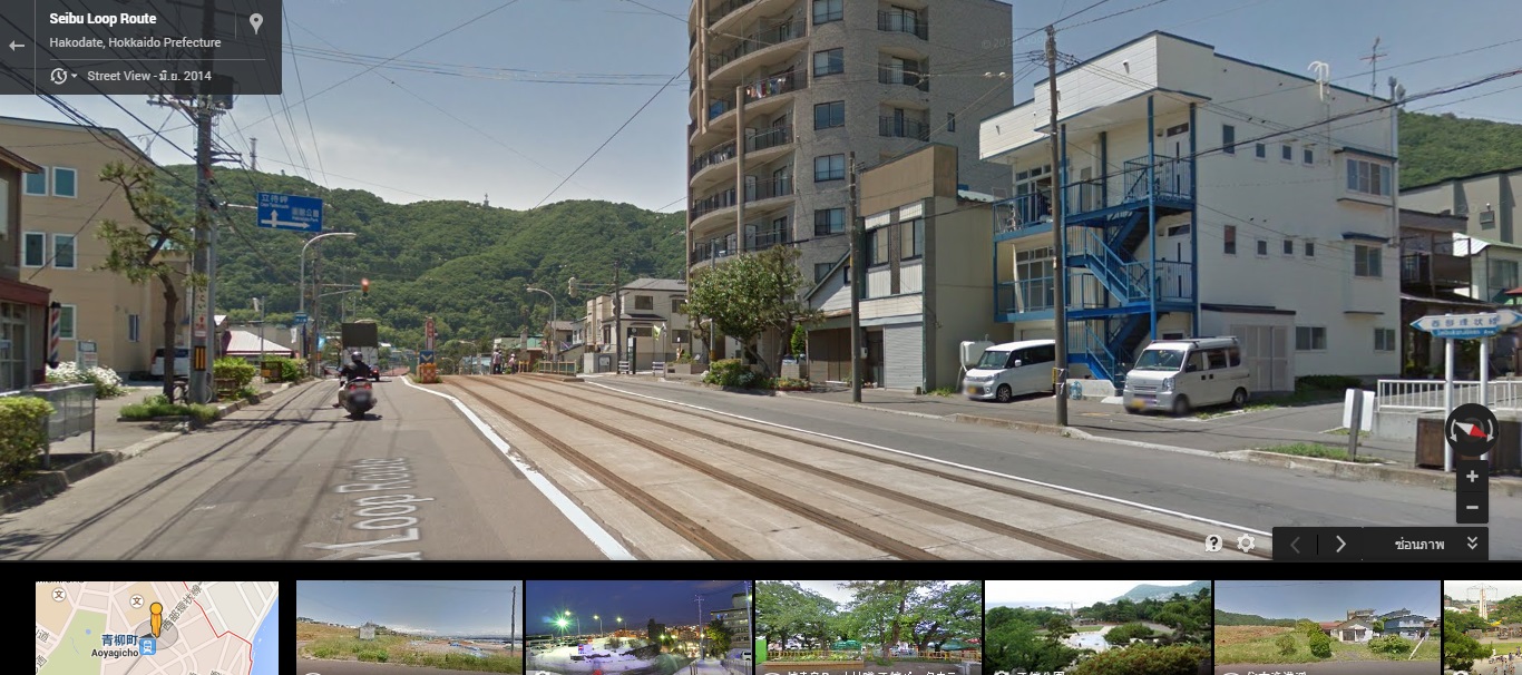 สถานที่เป็นที่ดูก็จะเป็นเขา Hakodate, สถานีรถราง กับถนนที่อยู่บนเนิน เห็นวิวทะเล