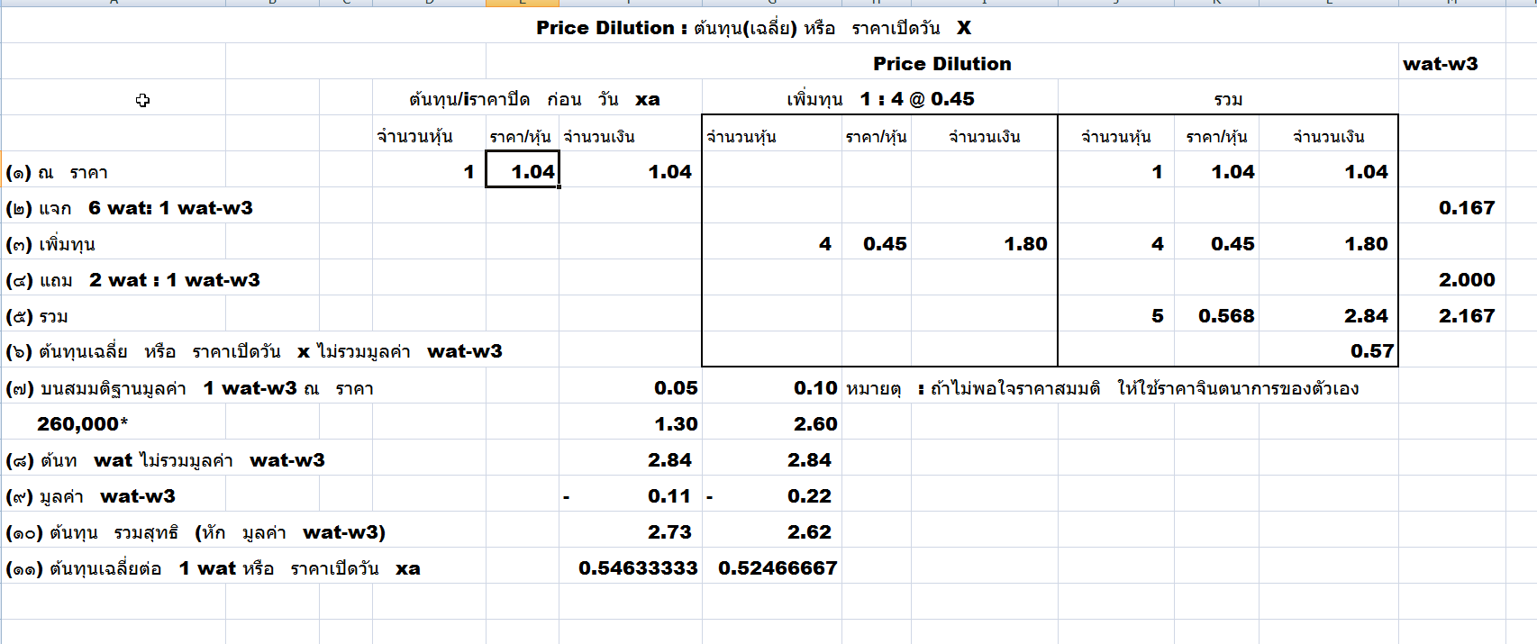 จะเห็นได้ว่าตารางแสดงตัวเลขต่างๆที่น่าสนใจศีกษาผลดีผลเสีย เช่น เม็ดเงินที่ต้องจ่ายในการใช้สิทธิซื้อหุ้นใหม่เพิ่มทุน ฯลฯ เพื่อผลประโยชน์ตัวเองลองคำนวนโดยใช้ต้นทุนแท้จริงของตัวเอง ให้พิจารณาถึงความเป็นไปได้ ถ้าไม่เข้าใจว่าอะไรเป็นอะไรน่าปล่อย wat ออกก่อนปิดตลาด 27/1/2558 ได้เสียเงินเราไม่ใช่ผู้อื่น