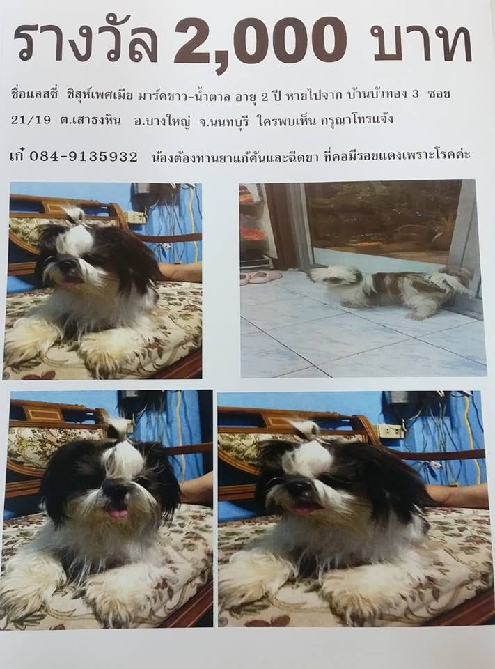 รบกวน ฝากแชร์ ติดตาม ใครอุปการะน้องไว้ ส่งมอบคืนมีรางวัลให้ 2000 บาท เนื่องจากสุนัขชื่อแลสซี่ ได้หลงจากบ้านไปตั้งแต่วันที่ 8 ม.ค. 2558 หมู่บ้านบัวทอง 3 นนทบุรี ติดต่อได้ที่เบอร์ 0849135932
