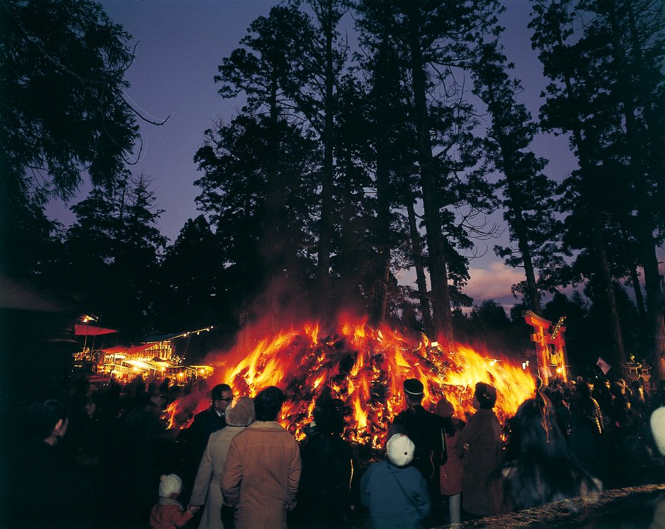 ที่ศาลเจ้าจะมีการก่อกองไฟศักดิ์สิทธิ์กองโตเพื่อให้ชาวเมืองนำเครื่องรางคุ้มครอง (O-mamori) เครื่องประดับวันปีใหม่ที่ใช้ในการต้อนรับเทพเจ้า หรือของต่างๆที่คิดว่าศักดิ์สิทธิ์ เช่นบทสวดมนต์ ลูกประคำมาเผา เห็นบางคนก็เอาของที่มีความหมายทางโลกวิญญานมาเผาด้วยเหมือนกัน เช่นตุ๊กตาแปลกๆ บัตรโรงพยาบาล (คงเป็นของสมาชิกครอบครัวที่ตายไปแล้ว)
