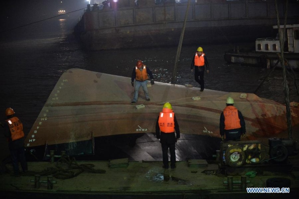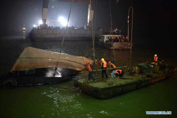 สภาพเรือโยงนอนหงายท้องหลังเกิดเหตุพลิกคว่ำและจมลงในแม่น้ำแยงซีเกียง โดยเจ้าหน้าที่ต้องใช้เครนยกช่วยเคลื่อนย้ายเรือเข้าฝั่ง ขณะที่ยังมีผู้สูญหายอีกมากกว่า 20 ราย วันที่ 16 ม.ค. 2557 (ซินหวา)