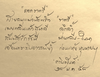 หากท่านใดสนใจฟังเพลงเปียโนประกอบกลอนอื่นๆ ที่อยู่ในชุดเพลงเดียวกันนี้ (ชุดเพลง "ดอกไม้สีขาว") สามารถเข้าไปติชมได้ที่นี้ครับ