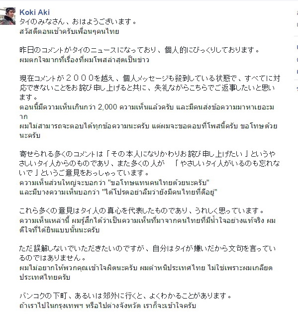 จากกรณีหนุ่มนักท่องเที่ยวชาวญี่ปุ่น ออกมาโพสต์ผ่านเฟซบุ๊คส่วนตัว โดยเป็นการวิจารณ์ถึง "ความไม่ประทับใจ" การบริการของสนามบินสุวรรณภูมิ โดยโจมตีรุนแรงด้วยคำว่า สนามบินที่แพงที่สุด และน่ารังเกียจที่สุด ในประเด็น "การบริการ" และ "ค่าแท็กซี่" เป็นหลัก ล่าสุดชาวญี่ปุ่นคนดังกล่าวได้โพสต์ข้อความใหม่อีกครั้ง หลังพบว่าโพสต์ของตัวเองกำลังเป็นข่าวดังและเป็นที่วิพากษ์วิจารณ์อย่างกว้างขวาง ซึ่งนักท่องเที่ยวชาวยุ่นยังยืนยันรักประเทศไทยเหมือนเดิม พร้อมย้ำ ภาพลักษณ์ที่ไม่ดีของประเทศไทย เกิดจากคนไม่กี่คนเท่านั้น โดยข้อความมีดังนี้.....