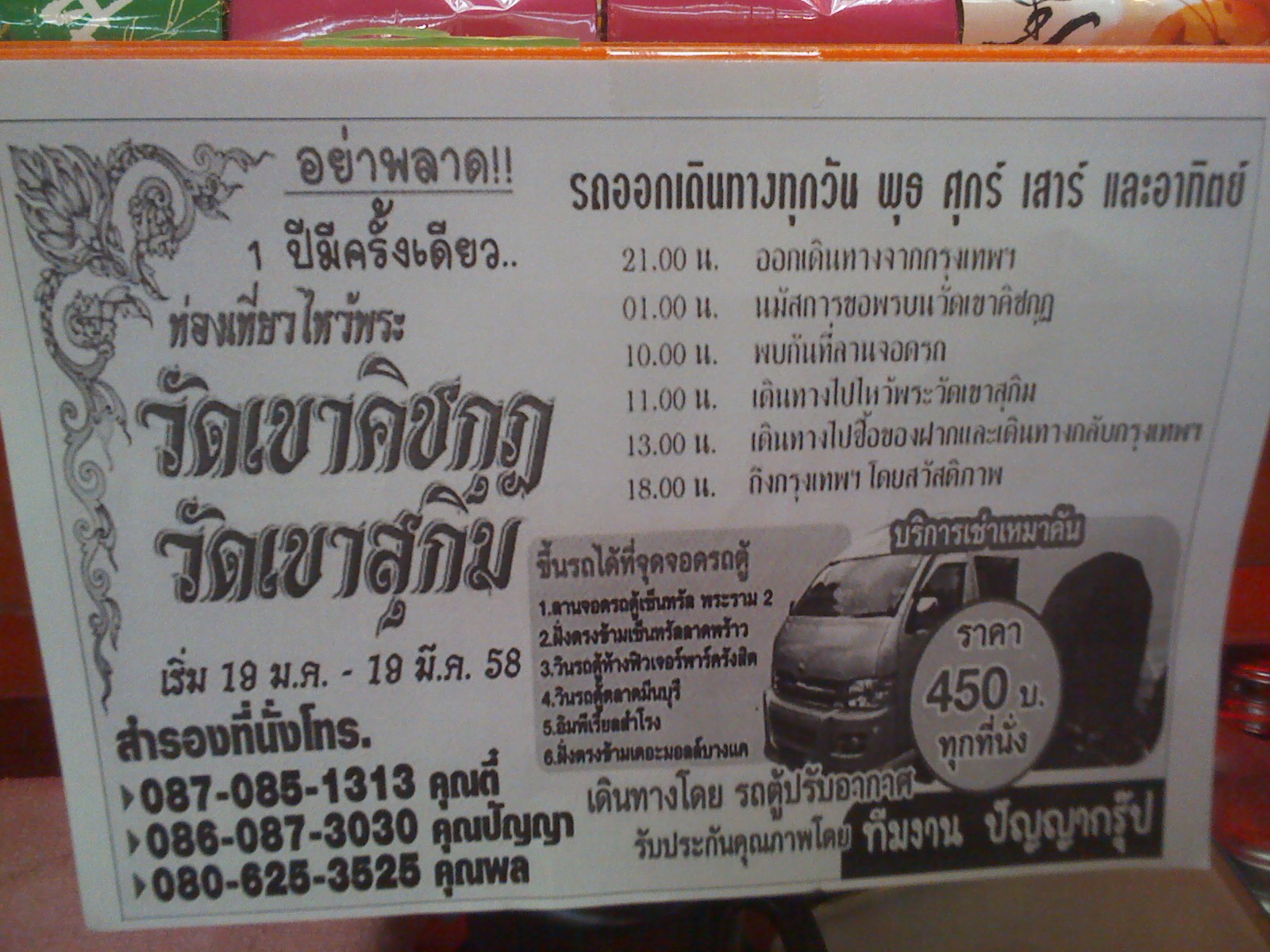 ตารางการเดินทางของรถตู้สำหรับท่านที่สนใจจะไปไหว้พระที่เขาคิชกูฎค่ะ(ถ่ายมาจากใบปลิว)