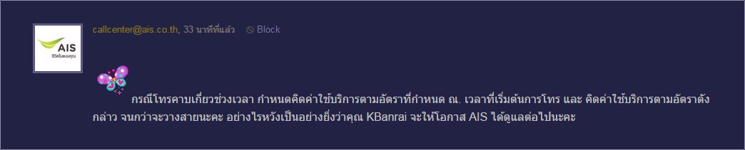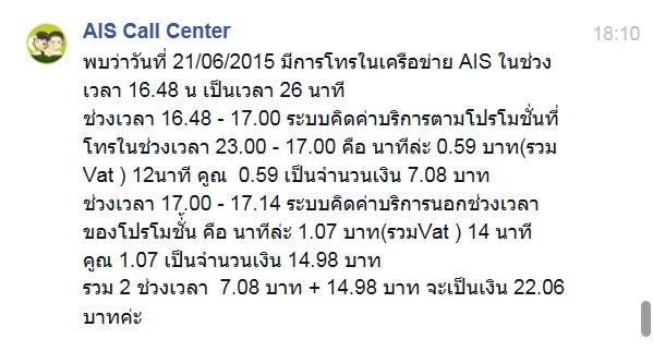 เมื่อเย็นวันนี้ 21 มกราคม 2558 โทรหาเบอร์ AIS เวลา 16.48 น. นาน 26 นาที ระบบเตือนเงินหมด เช็คเงินเหลือไม่กี่บาท แต่เช็คแล้วค่าบริการหมดไป 22.06 บาท