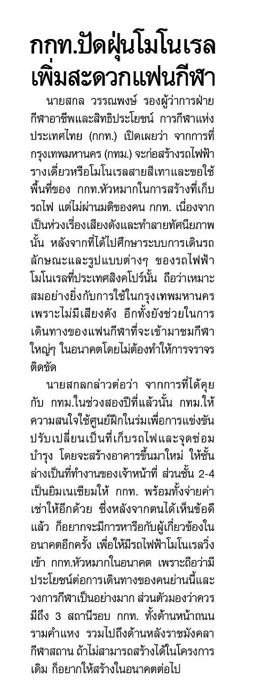 กกท.ปัดฝุ่นโมโนเรลเพิ่มสะดวกแฟนกีฬา