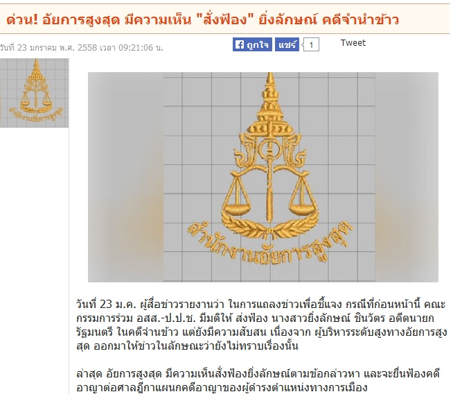 ด่วน! อัยการสูงสุด มีความเห็น "สั่งฟ้อง" ยิ่งลักษณ์ คดีจำนำข้าว (อาญา ไม่มีส่ออออออออออออ นะ)