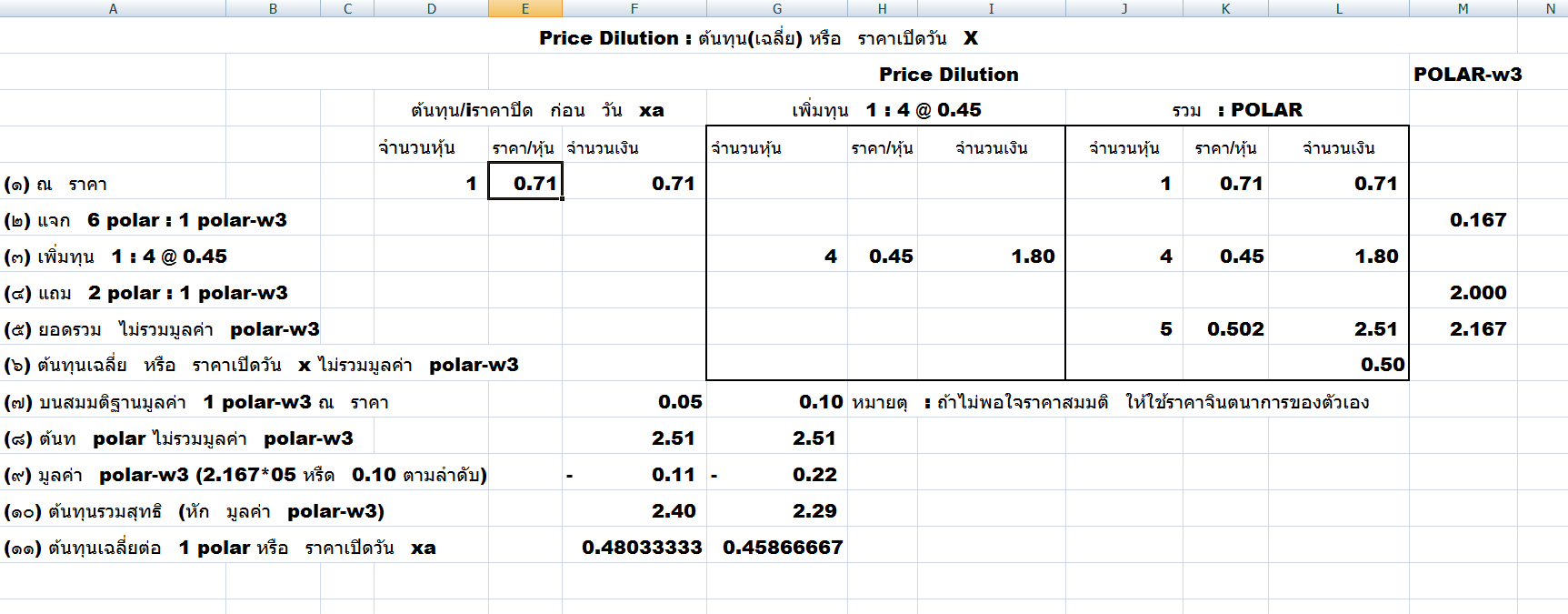 ตัวเลขในภาพบอกแราหลายๆอย่างๆ เช่น ณ ราคาปิดวันนี้ 0.71 ต้องใช้เงินถึง 1.80 บาท หรือ 2.54 เท่าในการเพิ่มทุนซื้อหุ้นใหม่ หรือ สามารถคำนวนต้องใช้เงินเท่าไร เช่น มี 60,000 polar ต้องใช้เงิน = 60,000*4*0.45 = 108,000 บาท เป็นต้น ถ้าไม่สะบายใจ รวมราคาในกระดานจะไดลูทลงมาดั่งแสดงในภาพ ก็ยังมีเวลาพิจรณาในวันจันทร์ 26/1/2558 ถึง ก่อนปิดตลาดวันอังคาร 27/1/2558 จะเอาอย่างไรก็แล้วแต่วิจารณญาณของท่าน ยกเว้นยินดีที่จะลุ้นราคาต้องดีขึ้นระหว่างจ่ายตังค์จองซื้อหุ้นใหม่ 23 ก.พ. 2558 - 27 ก.พ. 2558 มิฉะนั้นแล้วไม่มีใครซื้อหุ้นใหม่ ถึงกระนั้นคิดว่าราคาปิดในวัน 27/1/2558 เท่าไร